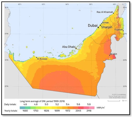 - Solargis. Solar resource maps of United Arab Emirates. Available online: https://solargis.com/maps-and-gis-data/download/united-arab-emirates (accessed on 14 April 2022).