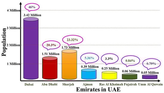 The entire area of the UAE is 83,600 km2, with desert covering 74% and mountains covering 2.6% [47]. As illustrated in Figure 5, the nation contains over 200 islands and a total population of 10 million as of 2021 [50].