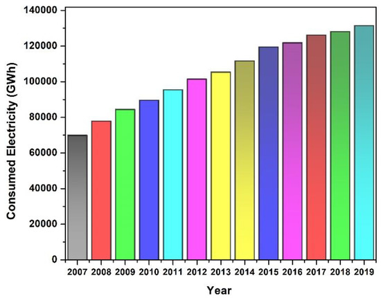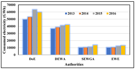 Electricity pricing is affected by governmental incentive schemes and regulations, domestic economic fuel prices, and local weather. The price of electricity in the UAE varies between emirates as well as between expatriates and citizens. Electricity prices in the UAE have been reformed numerous times. Their impact on the country’s citizens has been limited, but they have had a greater impact on expatriates. While the distribution of electricity prices for Dubai and Sharjah is based on monthly consumption slabs, the prices in Abu Dhabi vary depending on housing type (villa or apartment), with the segments based on daily levels of consumption. The emirates of Dubai and Abu Dhabi have relatively high commercial and industrial activity [86,87,88]. To satisfy demand, DoE also exports power to neighboring emirates [89]. These four organizations work to fulfill a need that is increasing at the same rate as the population. Electricity consumption is related to the high cooling load required to maintain thermal comfort in the UAE [90].