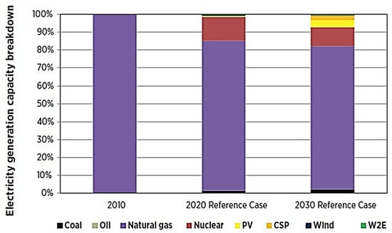 In the past, several other reviews have been published, including Adel Juaidi et al. [3] who deals with energy production, consumption, and greenhouse gas emissions in the UAE. The nuclear and solar energy sources in the UAE were studied by Mehmet F. Orhan et al. [43], in which integrated hydrogen production and thermodynamic analysis were details analyzed based on these sources, and Valerie Eveloy and Tesfaldet Gebreegziabher [44] investigated future power production options for the UAE, focusing on concentrated solar power (CSP) with thermal energy storage and solar photovoltaic (PV). An overview of greenhouse gas emissions from the energy sector in the UAE was studied by A.N. Khondaker et al. [45]. Steven Griffiths and Robin Mills [46] investigated the possibilities of rooftop solar PV in the growth of the UAE’s energy grid. Zafar Said et al. [18] investigated predictions of the UAE’s renewable energy mix in 2030.