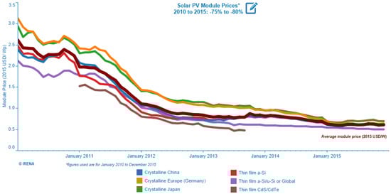 Solar cell production used to be a challenge, owing to its low cost-effectiveness. Many studies have been conducted to minimize such production costs to produce better PV systems [66]. Figure 12 depicts the pricing of solar PV modules in USD per watt from 2010 to 2015. Silicon technology is popular in solar cell design due to its efficiency and suitability. The cost for solar cell manufacturing was reduced from 1.525 USD/Wp in the year 2011 to 0.478 USD/Wp in the year 2013 for thin-film CdS/CdTe; the price of crystalline material (manufactured from Japan) was reduced to 0.697 USD/Wp in the year 2015 from 2.944 USD/Wp in the year 2010; the price of the thin-film a-Si/u-Si module was reduced from 2.127 to 0.503 USD/Wp between 2010–2015; the price of crystalline material (manufactured from Germany) was reduced from 3.129–0.643 USD/Wp between 2010–2015; and the price of crystalline material (sourced from China) was reduced to 0.599 from 2.389 USD/Wp between 2010–2015. All of this is attributable to the PV sector’s implementation of cutting-edge technologies. Furthermore, the solar thermal sector is rapidly expanding. Various collectors are used to capture sunlight in order to create heat with the least amount of loss, which makes them ideal for creating job opportunities in the renewable energy sector. This shows that it is critical to identify the future roles of various energy sources and to explain the actions necessary to transition to a sustainable future energy system.