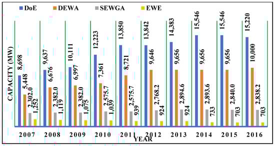Electricity capacity in DEWA, DoE, SEHA, EWE (MW) [81].