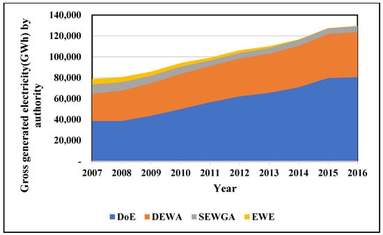 Each utility has its own rate structure, planning, and investment processes [72,73,74,75]. Electricity consumption for each authority from 2013 to 2016 is shown in Figure 13. The DoE authority has the highest consumption of electricity with around 224,372 GWh, i.e., 47.6%, followed by 157,244 GWh for DEWA (33.4%), 44,153 GWh for SEWGA (9.4%), and 45,063 GWh for EWE (9.6%) [76,77]. Figure 14 shows the electricity capacity (MW) of these four authorities from 2007 to 2016. It is clearly shown that electricity capacity increased from 2007 to 2016 due to an increase in demand for electricity. DoE has a 129,056 MW capacity, i.e., 51.8%, followed by 83,817 MW for DEWA (33.7%), 26,451 MW for SEWGA (10.6%), and 9411 MW for EWE (3.8%). Moreover, these four emirates authorities have increased their capacity to 28,761 MW in 2016 from 17,700 MW in 2007. Figure 15 shows the gross generated electricity by each authority from 2007–2016 [78]. Only the DoE and DEWA authorities have increased their gross generated electricity, from 38,592 GWh (2007) to 80,527 GWh (2016) and 26,030 GWh (2007) to 43,091 GWh (2016), respectively, whereas SEWGA and EWE have reduced gross electricity generation from 8968 GWh (2007) to GWh 5684 (2016) and 5171 GWh (2007) to 292.54 GWh (2016), respectively, which is due to less investment in the electricity sector. DoE has a gross generated electricity of 586,099 GWh, i.e., 57.1%, followed by 352,951.95 GWh for DEWA (34.4%), 64,241.86 GWh for SEWGA (6.3%), and 24,405.14 GWh for EWE (2.4%) [79,80]. Figure 16 shows the import–export electricity quantity by country from 2012 to 2016.