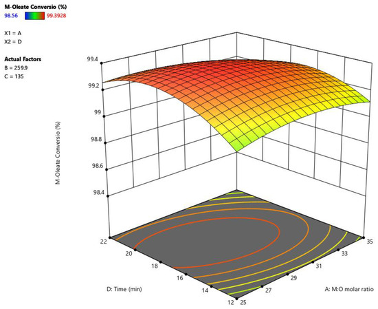 One of the main advantages of using supercritical methanolysis is the significant reduction in reaction time. In the present study, the reaction time has shown a significant influence on methyl-oleate as reported in Table 5. In addition, reaction time has been reported with a highly significant effect on the yields of methyl-palmitate, methyl-linoleate, and methyl-myristate as shown in Table A2, Table A3 and Table A4, respectively. Increasing reaction time has shown a positive effect on all FAMEs yields up to 20 min at a lower M:O molar ratio as shown in Figure 1. However, at a higher M:O molar ratio the reaction time has an increasing effect up to 17 min. The interactive effect between M:O molar ratio and reaction time has recorded a significant effect on FAMEs’ yields as illustrated in Table 5, Table A2, Table A3 and Table A4. It is clearly shown in Figure 1 that the effect of reaction time on methyl-oleate yield at a lower M:O molar ratio is not similar to its effect at a higher M:O molar ratio. Hence, a significant interactive effect between reaction time and M:O molar ratio is observed as reported in Table 5. Similar results of the effect of reaction time have been observed on the yields of methyl-palmitate, methyl-linoleate and methyl-myristate as shown in Figure A4, Figure A5 and Figure A6, respectively. Consequently, the variation of the reaction time effect should be considered within the optimisation process. These results are in agreement with previously reported studies where a significant interaction between reaction time, M:O molar ratio and the temperature has been reported previously [25]. In addition, a study on biodiesel production from high acidity tobacco seed oil has reported a significant interaction between reaction time and M:O molar ratio [26]. They have observed a decreasing effect on biodiesel yield at a longer reaction time where thermal degradation of methyl esters is considered an acceptable explanation for the yield drop.