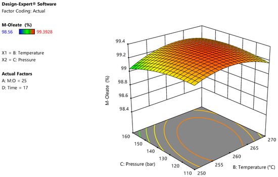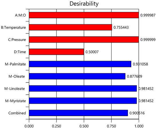Several process variables interactions have been reported in this study where the influence of the process parameters varies according to the reaction conditions. Consequently, a multi-targeting numerical and graphical optimisation using RSM has been established to develop the optimal conditions based on a combination of the process variables’ interactions. The optimisation goals have been set to maximise all FAMEs yields while minimising reaction variables. The specific importance of each goal parameter has been identified where maximising FAMEs yields have been set to the highest importance. Minimising reaction temperature and time have been set with high importance followed by M:O molar ratio and reaction pressure as shown in Table 6. RSM has been implemented to evaluate the best combination of reaction parameters that could achieve the required goals with high desirability [26,33]. Accordingly, 34 solutions have been developed using numerical optimisation where the solution with the highest desirability has been considered. The developed conditions have resulted in achieving 99.16%, 99.3%, 99.15%, and 99.16% of methyl-oleate, methyl-palmitate, methyl-linoleate and methyl-myristate yields, respectively. The optimal conditions have been reported M:O molar ratio of 25:1, 255 °C, and 110 bar within 17 min. The desirability of each process parameter and response has been illustrated in Figure 4, in addition to the combined process desirability. Graphical optimisation has been employed to check that the developed conditions have achieved the highest desirability as shown in Figure 5. Furthermore, the predicted optimal conditions have been validated experimentally with relative errors between 0.5 and 0.85%.