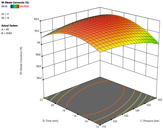 The ANOVA results shown in Table 5 have presented a significant effect of pressure on methyl-oleate yield. Reaction pressure has a significant negative effect on biodiesel yield at 250 °C, however, it has a negligible effect at higher temperatures i.e., 270 °C. This is attributed to the possible degradation of FAMEs at high pressures, in addition the presence of CO2 contributes to lowering the system’s critical point where a higher degradation rate is expected at higher temperature and pressure [30]. Similar results have been reported for the effect of high pressure on biodiesel yield [31]. They have reported that the solubility of methanol in oil decreases by increasing the pressure beyond the critical pressure. Similarly, an increase in pressure has a negative effect on biodiesel produced from soybean flakes lipids [32]. However, the total change in yield at extreme conditions has about only a 1% difference in methyl-oleate yield, which refers to the constant high yield of biodiesel from high FFA feedstock using supercritical methanolysis. The interactive effect between reaction time and pressure has been reported with a significant effect on methyl-oleate yield as shown in Figure 3. Similar significant interactions have been also observed in the yields of methyl-palmitate, methyl-linolinate and methyl-myristate as shown in Figure A7, Figure A8 and Figure A9, respectively. These results demonstrate that the effect of reaction pressure on the yield is not constant at different levels of reaction temperature and time. Similarly, a significant interaction between reaction temperature and pressure for biodiesel production from WCO has been reported previously [29].