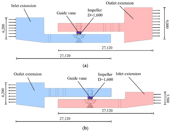 CFD calculation model of pump device: (a) drainage condition; (b) diversion condition.
