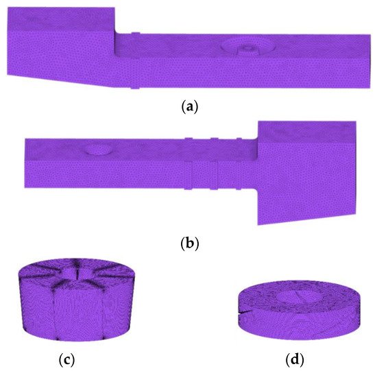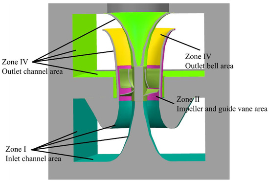 Schematic diagram of grid division of the pump device: (a) inlet channel; (b) outlet channel; (c) guide vane; (d) impeller.