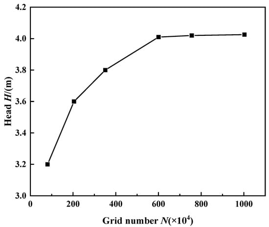 Mesh the impeller, guide vane, inlet, and outlet channels and their extension sections. The schematic diagram of the grid is shown in Figure 4. Theoretically, the more grids there are, the more accurate the calculation results will be, but correspondingly more computing resources will be required. In order to improve the calculation speed and, at the same time, ensure the accuracy of the numerical simulation results, numerical calculations were carried out for different grid numbers of the pump device under the design flow condition. It can be seen from Figure 5 that when the number of grids exceeded 7.56 million, the head of the device changed little, and the number of grids had little effect on the calculation results. Therefore, in order to save computing resources, the final overall computing grid number was determined to be 7.56 million.