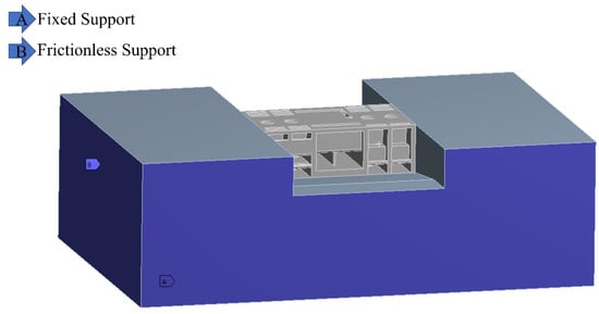 For the boundary conditions of the station building calculation, the vibration of the filling was considered, the bottom of the filling was the fixed end constraint, and the surrounding was the normal constraint. The boundary nodes of the side wall of the station building were in contact with the filling in the normal direction, the normal direction was deformed together, and the tangential direction was not constrained. The schematic diagram of the setting of boundary conditions is shown in Figure 6.