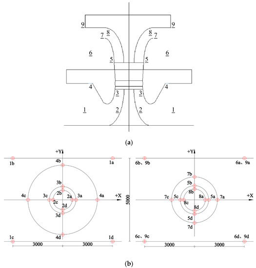 Layout of pressure fluctuation monitoring points: (a) layout of flow channel monitoring section; (b) layout plan of the pressure fluctuation measuring points. Red ring representative monitoring points.