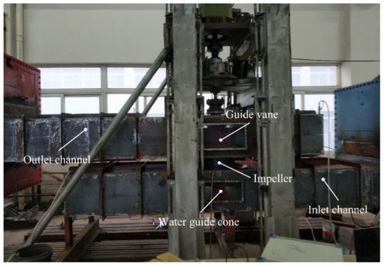 In order to verify the accuracy of the numerical simulation of the two-way channel pump device, the model test of the dual-flow channel pump device was carried out on the high-precision hydraulic machinery test bench ast Jiangsu Key Laboratory of hydraulic power engineering. The diameter of the impeller model was 300 mm and the model scale of the water pump device was 1:5.33. The test speed of the model pump was determined to be 1307 r/min according to the equal head conversion with the prototype. See Figure 8 for the diagram of the model test device. The test results are converted to the performance data of the prototype pump device, and the external characteristics are compared with the results of numerical simulation under different working conditions. The comparison results are shown in Figure 9. It can be seen from the figure that the overall trend of the performance curve obtained by the test and numerical simulation is similar, the coincidence degree is high under the design working conditions, the overall fit between the test and numerical simulation is good, and the calculation method and results adopted by the numerical simulation are effective.