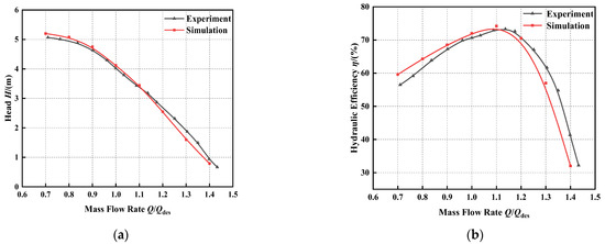 Comparison between numerical simulation and model test of hydraulic performance: (a) flow head performance curve; (b) flow efficiency performance curve.
