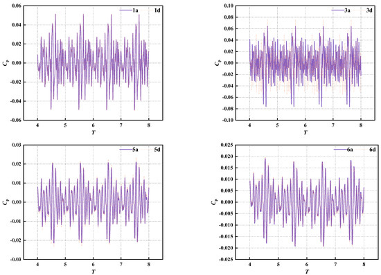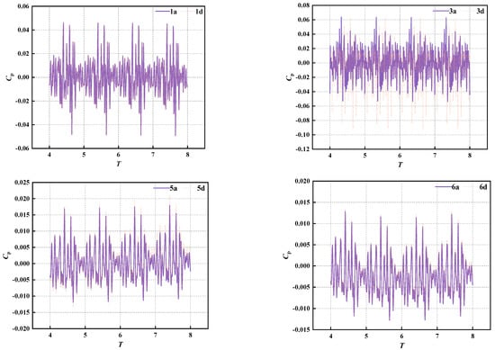 In order to eliminate the influence of the static pressure of the monitoring point on the overall pressure pulsation, the pressure pulsation coefficient was introduced to represent the pressure pulsation. Taking the water pressure pulsation at the side wall of the inlet and outlet channel and the monitoring points at the impeller guide vane as an example, Figure 10 and Figure 11 respectively present the time domain diagrams of the water pressure pulsation at the characteristic monitoring points under two working conditions.