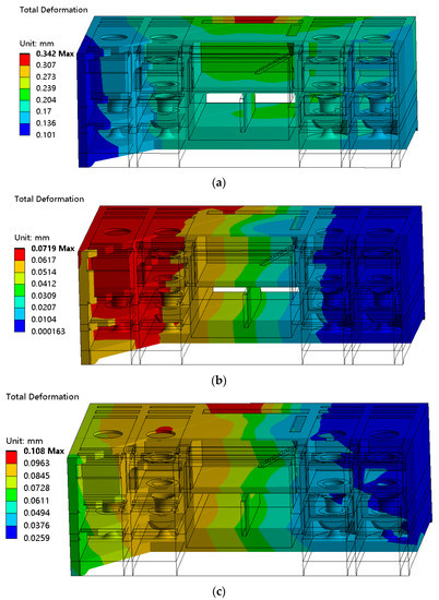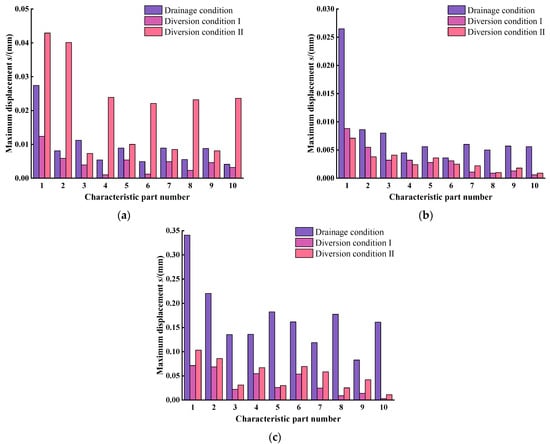 Maximum dynamic displacement of characteristic parts: (a) X-axis; (b) Y-axis; (c) Z-axis.