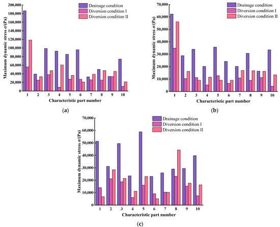 Maximum dynamic stress at characteristic parts: (a) X-axis; (b) Y-axis; (c) Z-axis.