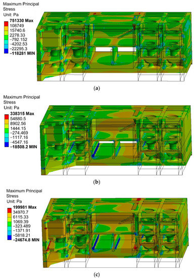 The total dynamic stress nephogram of the station building structure under each working condition is shown in Figure 16. It can be seen from the nephogram that the maximum total dynamic stress under the drainage working condition is greater than that under the other two working conditions, the stress distribution trend and amplitude trend under the drainage working condition are basically the same, and the dynamic stress of the bottom plate of the inlet and outlet channel is affected by the water pressure pulsation acting on it, which is greater than that of the upper floor slab. Under the two diversion conditions, the dynamic stress of the bottom plate of the inlet channel is greater than that of the bottom plate of the outlet channel. By comparing Figure 16b,c, it can be seen that the startup of unit 2 has a greater impact on the whole gate station.