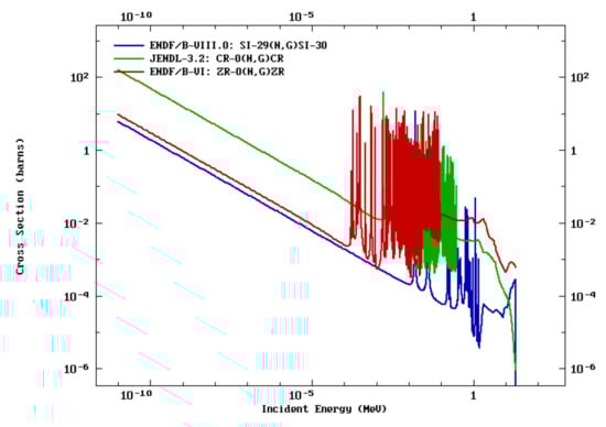 In addition to the reference cladding material “zircaloy-4,” the ceramic SiC and FeCrAl fuel-cladding systems were selected due to their higher corrosion resistance compared with the reference system [24]. Furthermore, the SiC ceramic was selected owing to its excellent performance in coating TRISO particles in high-temperature reactors [25,26] and its ability to reduce the generation of hydrogen gas under abnormal operating conditions [27]. FeCrAl has been investigated as a replacement for the reference cladding material owing to its improved high-temperature steam oxidation, which affords less hydrogen generation [28] under severe operating conditions [20]. To better understand the material composition, density, and thermal neutron economic effect of each system, the component elements as well as their interaction with the thermal neutron properties of each cladding material are summarized in Table 2. This table presents the chemical compositions of the cladding materials, and thermal neutron absorption cross-sections for the reference and alternative cladding materials. Figure 2 shows energy-dependent cross sections for reference and alternative cladding materials.