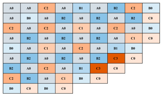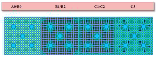 The APR 1400 core contains 241 fuel assemblies, 93 control element assemblies, and 61 in-core instrument assemblies [32] with an active height of 3.810 m in a cylinder whose diameter is 3.647 m [33]. Each fuel assembly comprises 236 UO2 rods with different enrichments. Most of the assemblies are mixed with gadolinium and five guide tubes [34]. Three types of normal assemblies without gadolinium were used, denoted as A0, B0, and C0. The other assemblies with Gd2O3 rods were denoted as B1, B2, C1, C2, and C3 [35]. Table 3 presents the specifications of the APR-1400 core design. Figure 3 shows the loading patterns of the fuel assemblies through the core.