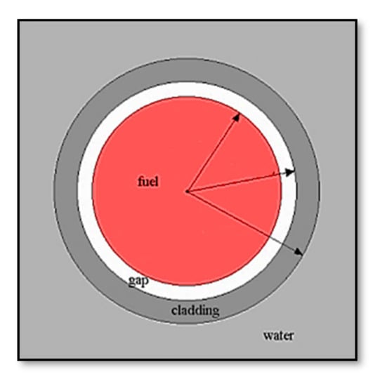 In this study, the applied pin-cell fuel enrichments were 1.68, 3.14, and 2.64 wt% with an exterior fuel pellet radius of 4.095 mm, helium gap of 85.0 µm, and cladding thickness of 570.0 µm [13]. Calculations for the fuel pin-cell model were performed using the collision estimator adopted in the Serpent 2.31 code [41]. The temperature for UO2 was set to 900 K, whereas those for the cladding material and moderator were set to 600 and 580 K, respectively. Figure 5 presents the fuel pin-cell model generated using the Serpent 2.31 code.