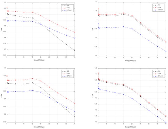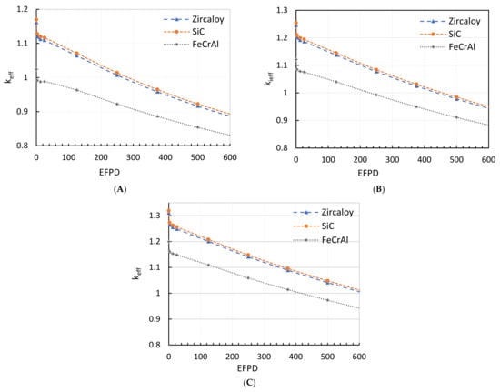 Neutronic analyses were performed on the APR-1400 reactor fuel assemblies. Eight types of fuel assemblies were required to perform these analyses, as presented in Figure 4. In this study, the fuel enrichment and cladding thickness remained unchanged, as in the reference fuel-clad system. Figure 8 shows that the curves of the B0 assembly exhibited the same tendency as a function of burnup, whereas the higher-absorption cross-section of FeCrAl resulted into lower values of keff. At BOC, the keff values for the Zr and SiC cladding systems were similar (i.e., 1.23772 ± 0.00011 and 1.24733 ± 0.00011, respectively) and substantially lower than those for the FeCrAl cladding (1.12775 ± 0.00012). The maximum reactivity differences at the BOC between the reference Zr and each of the SiC and FeCrAl were approximately 770.0 and −9751.0 pcm, respectively. Furthermore, fuel assemblies B1, B2, C1, C2, and C3 were modeled by inserting 16 gadolinium rods in each assembly except for C3 (12 were inserted), as shown in Figure 4.