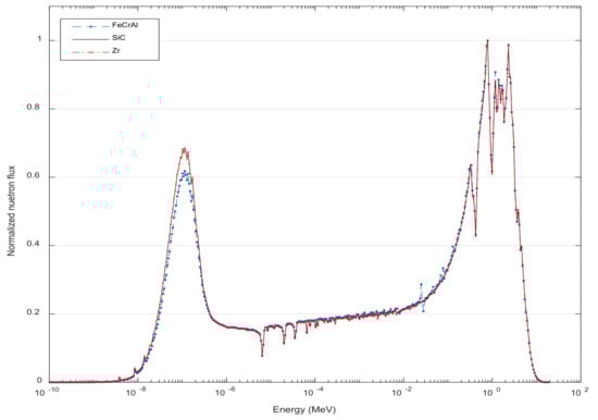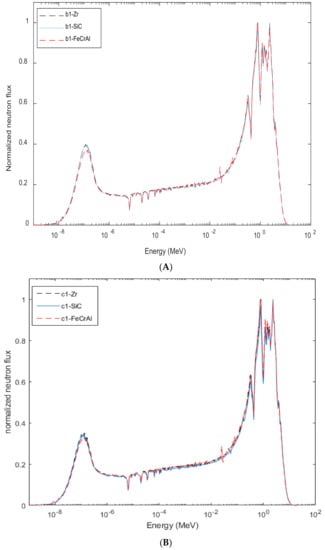 The neutron flux was examined in the reactor design analysis because it is the main quantity that controls the fission reaction inside the core. The higher the neutron flux, the greater is the likelihood of a nuclear reaction occurring owing to the greater number of neutrons passing through an area per unit of time. In other words, the higher the thermal flux, the greater is the possibility of fission by U-235. As such, the neutron flux controls the power inside the core. Power is the integral of the product of flux, the energy released by a single fission, and the macroscopic fission cross-section over both space and energy. Figure 11 presents the normalized neutron spectrum for several types of fuel assemblies, namely B1, and C1, at the BOC, for all types of cladding materials.