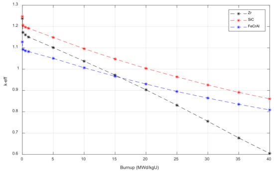As expected, for all the modeled cases, the high values of the absorption cross-section in FeCrAl cladding reduced the keff values during the cycle. On the other hand, the smaller absorption cross-section in SiC cladding caused an increase in the thermal neutrons inside the modeled system, resulting in higher values of keff through the fuel-cycle compared with the reference material. That makes the utilization of SiC cladding more favorable which has the highest excess reactivity, so the operating fuel cycle length is longer than the reference fuel-cladding system.