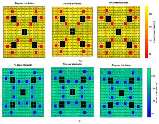Fuel assembly pin power distribution is an important output in neutronics safety analysis because it can be used to reduce the power-peaking factor and highlights the restricting fuel rod [43], i.e., the fuel rod with the highest heat flux at the cladding surface or the fuel rod with the highest fuel centerline temperature. It is also important to see if the distribution varies with time. In Figure 10, linear power distribution at the BOC of each pin of the specified fuel assemblies. The results were obtained and presented using the Serpent 2.31 code to simulate radial thermal neutron reaction rate and density distributions. The average linear powers for the B1-zircaloy, B1-SiC, and B1-FeCrAl assemblies were 186.68, 185.93, and 171.81 W/cm, respectively. By contrast, the linear power of the burnable absorber rod positions in the B1 and C1 fuel assemblies was approximately 37 to 39 W/cm for all types of fuel cladding. Additionally, the fuel rods nearest to the guide tube indicated linear powers greater than those of the remaining fuels. More thermalized neutrons migrated from the moderator region to the fuel area. Conversely, the linear power was much lower in the burnable absorber rods and surrounding rods than in the normal fuel rods due to the large absorption cross-section of material in these rods.