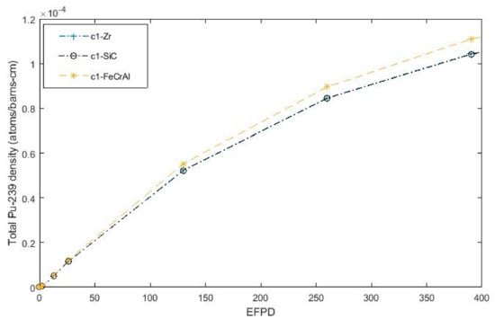 Figure 12 shows the incremental changes in 239Pu inventory during fuel life cycle of the reference material and both types of alternative cladding (SiC and FeCrAl) materials for the modeled C1 fuel assembly with gadolinium rods. The amount of accumulative plutonium depended primarily on the fuel enrichment, fuel pin configuration, and type of fuel-cladding system. As shown in Figure 11 and Figure 12, the material with a higher capturing rate of neutrons accumulated more plutonium. As expected, the hardening effect in the thermal region of the neutron spectrum was the greatest for the material with a higher-absorption cross-section or with fuel assemblies containing poisons such as gadolinium, as compared with the reference material (Zr). This was caused by an increase in the fast neutron population of the system because of the increased thermal neutron absorption in the steel-type cladding materials. Consequently, additional resonance capture of 238U occurred, which consequently increased plutonium generation. Hence, FeCrAl cladding resulted in a higher accumulation of plutonium as compared with Zr and SiC cladding.