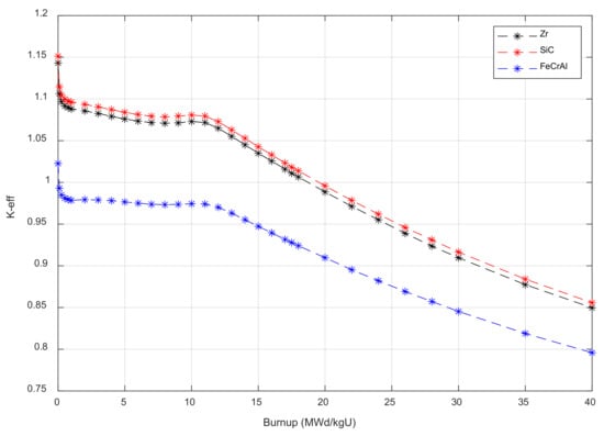 The excess of reactivity at BOC for the three different cladding materials results were as follows: 12,527 pcm for Zr, 13,142 pcm for SiC, and 2218 pcm for FeCrAl. As expected, the burnup reactivity swing between the BOC and EOC agreed well for Zr and SiC; however, it was much lower for FeCrAl as compared with that for Zr and SiC.