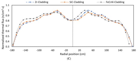 Figure 14 shows the initial 2D full-core calculations performed to evaluate the radial thermal neutron flux for both types of cladding materials at the BOC, MOC, and EOC. As observed, the thermal neutron flux was maximum at the center, and it decreased gradually toward the core boundary for both the Zr and SiC fuel-cladding systems. By contrast, the thermal flux was minimum at the center, and it increased toward the core boundaries in the FeCrAl fuel-cladding system. This happened because of the effect of the cladding material high-absorption cross sections on the hardening or softening of the neutron spectrum in a long-term operational light water reactor. Despite the reactivity penalty at the BOC, the FeCrAl cladding reduced the cycle length significantly because of its larger neutron-absorbing cross-section, even though its plutonium buildup was higher compared with the other cases. As a result, using FeCrAl cladding is not favorable in terms of the reactor core neutron economy, as present in Figure 13.