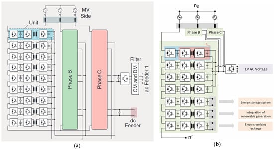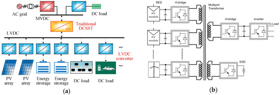 The MPST concept has been presented and analyzed in several previous works. In [18] an MPST is analyzed that has different ports for integrating DC microgrids, PV arrays, DC loads and DC electric vehicle chargers (Figure 2a). In this case, all the converters have output modules that share the same LV DC bus, and the input MMC modules, connected to the AC grid and MVDC bus, do not operate at different power points as in the case analyzed in this work.