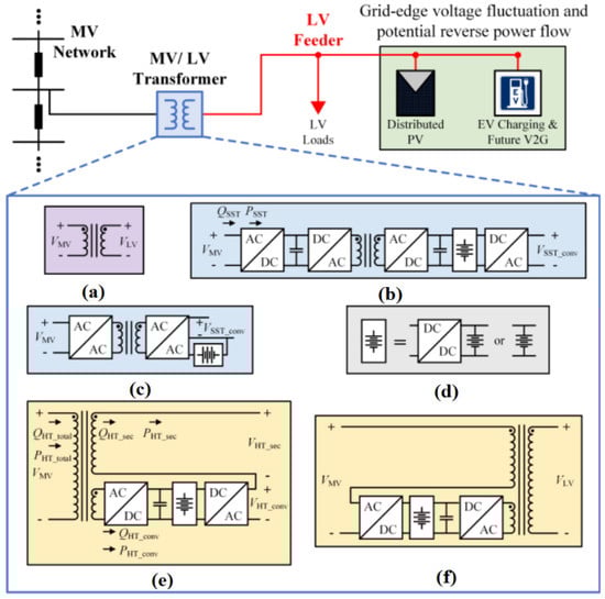 Solid state transformer (SST) and the hybrid transformer (HT) with integrated storage in active distribution grids [19]. (a) Line frequency transformer. (b,c) SST. Both the three stage SST in (b) and the single stage current source SST in (c) can realize controllability and storage integration. (d) Energy storage. (e,f) HT. The converter in the HT can be installed either on (e) LV side or (f) MV side of the transformer.