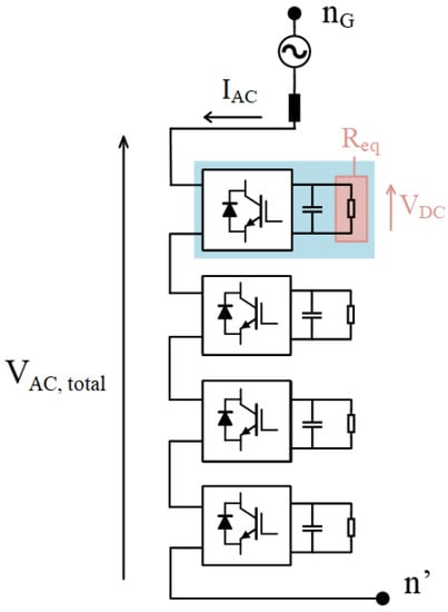 The architecture of the MPST schematically shown in Figure 1b is considered in this paper as the reference for a detailed analysis. The MPST is composed by several basic, modular, and identical power electronic blocks (PEB) with a nominal power PPEB. PEB could have different topologies [3] and the full-bridge alternative is selected in this paper because it allows better harmonic control (as discussed in [10,16,17]). The analysis of the proposed MPST can be conducted for a single-phase and easily extended to the three-phase operation, as the topology shown in Figure 1b is star connected.