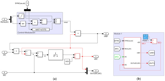 The final masked averaged model is shown in Figure 5b, where it can be seen that there are four main inputs: synchronization signals, modulation signals, the HV grid AC current and PEB output DC current; and two outputs: the PEB output DC voltage and PEB input AC voltage. The third input is only for visualization purposes.