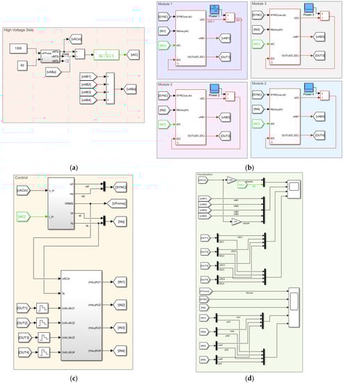 Overall high-level scheme in MATLAB/Simulink of the simulated MPST composed of four PEBs: (a) grid model and series connection of PEB HV terminals, (b) PEB models, (c) control strategy block and (d) visualization block.