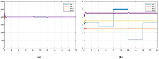 The results for the case A (when grid voltage is 1250 V) show that the operation strategy works in a right way controlling the output DC voltage in the PEBs to follow the established reference of 400 V (Figure 8a) and supplying the current to the loads corresponding to the given output power (Figure 8b). In Figure 8c grid voltage and current voltage are shown being possible to see how the grid current amplitude is adjusted according to the output power conditions. Figure 8d validates that only the direct current component is changing according to the output power, and that the quadrature components is cero in steady conditions as established in this operation mode, achieving the desired GUPF goal.