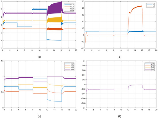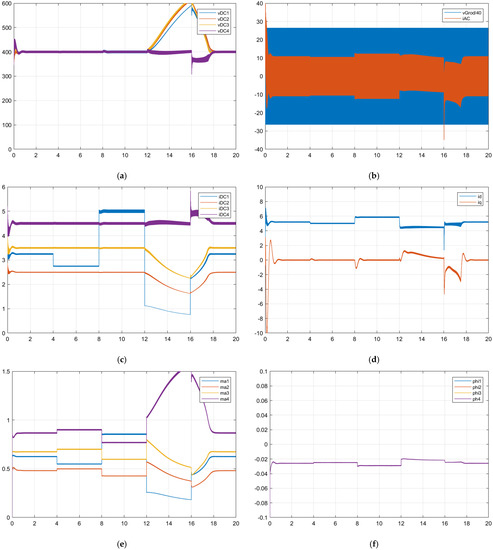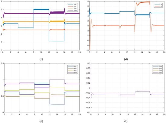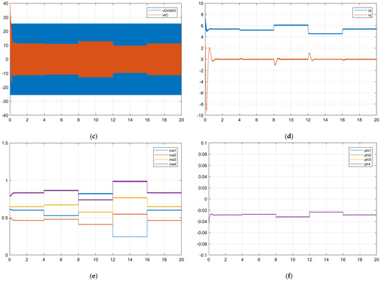 Figure 11 shows the results when using operation ERCO in case B conditions (grid voltage equal to 1300). The MPST operates properly in all simulation times, even in the period between 12 s and 16 s when previous operation strategies failed to control the system. It can be seen (Figure 11e) that during this interval, the maximum amplitude modulation index (ma4) is fixed to 1 by controlling the quadrature current component (Figure 11d) that obtains a value close to 10A. For the rest of the simulation time, no reactive power control is needed, as the amplitude modulation indexes are lower than 1, and the quadrature current components are zero.