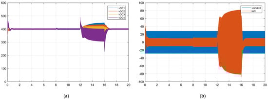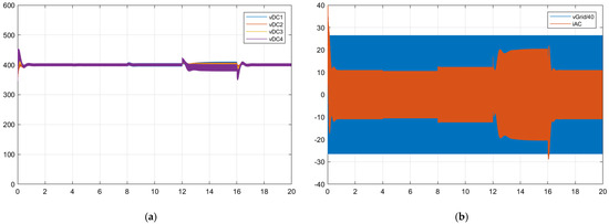 In this operation mode, if case B is considered (and grid voltage is 1300 V), the MPST is operating in the right mode until the power in port #1 (PEB #1) changes to 450 W (time between 12 s and 16 s). This low output power value produces an amplitude modulation index of PEB #4 that should be greater than 1 and activates the control to prevent the operation in the overmodulation zone. During this interval (12–16 s) the MPST is not controlled properly and the DC voltage is not following the reference value (Figure 9a), causing the rest of the modules to also be out of control (Figure 9).