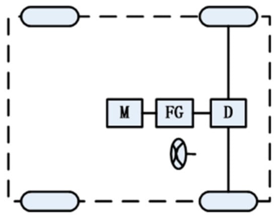 The electric drive system, depending on the arrangement position of the motor, can be basically divided into two types: motor centralized drive systems and motor distributed drive systems [12,13,14,15]. In the motor centralized drive system, as shown in Figure 1, the motor has constant power across a wide range of speed changes and a fixed speed ratio reducer is adopted. Since there is no clutch or transmission, the volume and quality of mechanical transmission can be reduced.