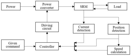 The motor in the wheel electric drive system is an SRM, while the driving of the loader should be performed by an SRD. The SRD system is a typical mechatronics technology that integrates power electronics, microelectronics technology and motor control technology, and it has excellent speed regulation performance. Compared with AC and DC motor drive systems, SRD systems can maintain high power output and operating efficiency across wide ranges of power and speed, so they are widely used in applications such as electric vehicles that require efficient mechanical characteristics. It was necessary to design the structure of the SRD and develop the control algorithm. As shown in Figure 4, the SRD was mainly composed of an SRM, a power converter, a controller and a position and current detector.
