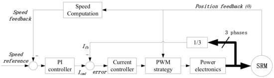 The control principle of the SRM speed-adjustment system is shown in Figure 5. The control method used in the system is a double-feedback-loop structure, in which the outer loop is for speed and the inner loop is for current. The speed feedback signal, calculated with the rotor position signal outputted by the position sensor and presupposed with a given speed, is the same as the input to the speed loop PI regulator. The output signal from the speed regulator is the same as the current instruction value and is compared with the actual phase current value measured by the current sensor, forming a current deviation inputted to the current controller so that the PWM signal’s pulse width can be controlled and the power circuit is triggered [25,26,27].