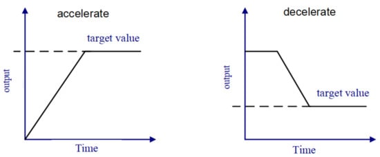 To solve the speed instability problem, the system uses the speed slope solution scheme. When the input speed increases, the output value increases along the preset slope until it reaches the expected value, as shown in Figure 6. When the speed needs to be reduced, the output decreases along the preset slope to the expected value. The speed instability problem can be significantly ameliorated with the speed slope solution so that the motor can output speed steadily.