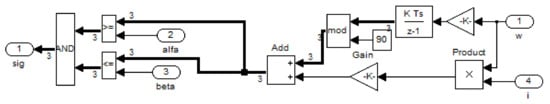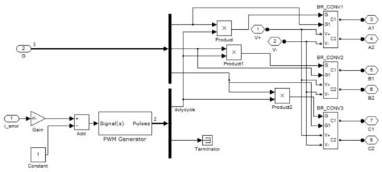 This simulation model describes a voltage-based PWM dual-feedback SRD system with speed and current as feedback. The SRM is powered by a three-phase asymmetric half-bridge power converter, as shown in Figure 8, which includes two IGBT power tubes and two freewheeling diodes in each phase structure, as shown in Figure 9. The lower-bridge-arm IGBT is always on, and the upper bridge arm is turned on and off with the PWM signal to adjust the positive voltage applied to this phase winding and achieve speed regulation. When both the upper and lower IGBT power tubes are turned off, the two windings form a negative voltage and the winding current is freed through the diode, returning the energy to the power supply. The position of the rotor is measured by the position detection module, as shown in Figure 10. Depending on the position of the rotor, the torque generation can be controlled by adjusting the on and off angles of the phase windings.