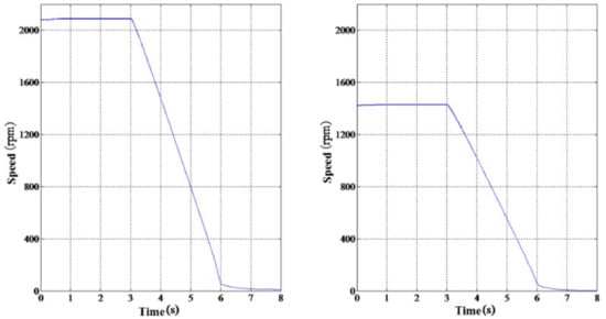 The V-type non-loaded and heavy-load conditions of braking were simulated. The SRM speed is 2090 rpm and 1430 rpm in the non-loaded and heavy-load conditions, respectively. The braking time is set to 3 s and the output torque of the motor in the braking process is 0. The results are shown in Figure 14. As can be seen, the SRM speed decreases to zero in 3 s.