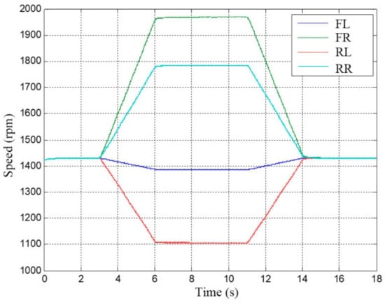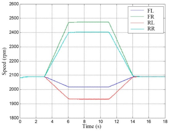 The loader needs to be steered frequently during operation. Simulations of the loader’s steering at 15° under non-loaded and heavy-load conditions were conducted. The steering transient time is set to 3 s and the steering process lasts for 5 s. The output speed of each driving motor is shown in Figure 15 and Figure 16.