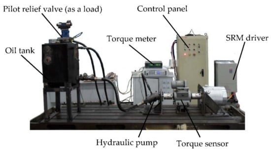 As shown in Figure 18, the test bench was composed of the SRM, the speed and torque sensors, the hydraulic motor, couplings, the bench base and the mount rack.