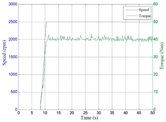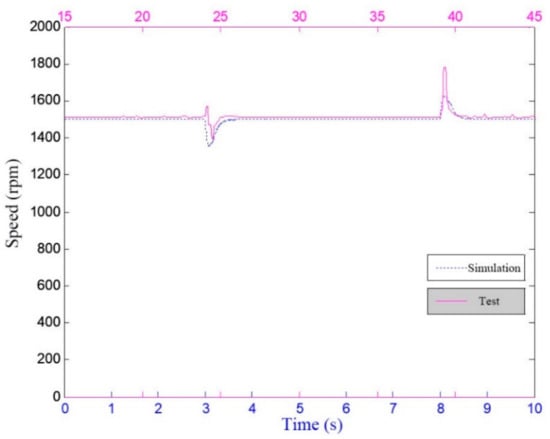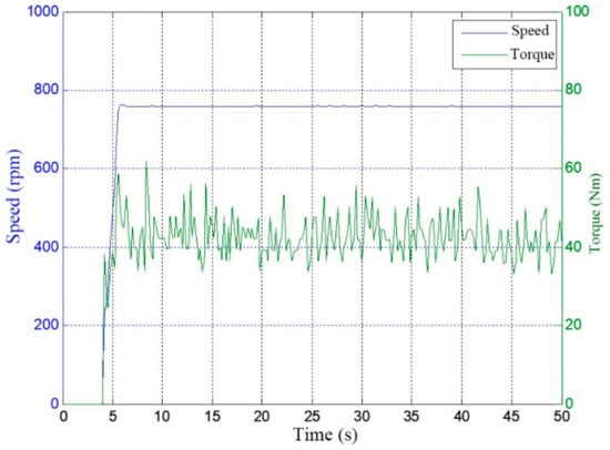For the motor speed response, the output speed of the motor was roughly the same in the simulation and the test, but there were some differences in the stabilization time and in the overshoot of the speed response, as shown in Table 5. Since the target SRD system has a ramp acceleration function and the ramp time is 3 s, the stabilization time of the system’s response to the speed in the test was less than 3 s when it was unloaded or loaded. However, the simulated system did not set the acceleration ramp, so the system responded quickly and the stabilization time was less than 1 s. The speed response overshoot in the simulation and test for the non-loaded process was 7% and 3%, respectively, which was due to the difference in the PI parameter settings for the simulation and the actual system. The parameter KP was too large, which led to a shortened response time and an increase in the overshoot. In the load state, the overshoot for the simulation and the test was 0, indicating that the load had an inhibitory effect on overshoot.