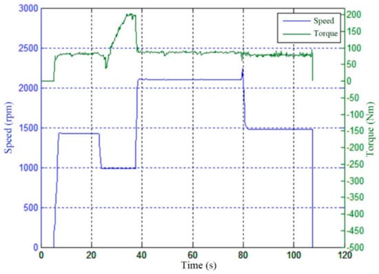 The experimental results of the V-type condition are shown in Figure 21. The V-type condition mainly includes four processes: idle running, cut-over, transporting and idle return. The four processes basically cover the entire working condition of the loader. A typical cycle of the operation takes about one minute. The speed and torque in each process are shown in Figure 21. During the idle running process, the loader is only affected by the ground’s force of rolling friction and rarely changes. When the cut-over process begins, the loader is affected by rolling and material resistance simultaneously. The material resistance grows with the cutting depth until loading is finished, and at that moment it reaches the maximum value. There is only rolling resistance during the transporting process, but it is a little larger than it is in the idle running process because the loader is in a heavy-load state. The resistance of the loader is the same as that during idle running.