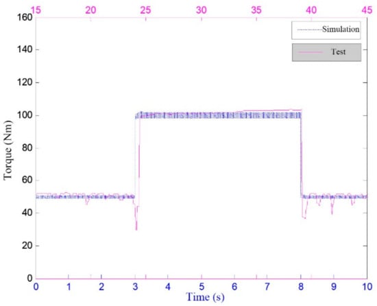 A comparison of the simulation and experiment shows that the speed’s and the torque’s jump forms were the same, so the simulation and experiment results were correct. However, the amplitude was different, as the torque’s adjustment in the experiment was determined by the solenoid switch. As shown in Figure 23, the load step in the simulation was an ideal square wave, while in the test the change of the load torque was controlled by the solenoid valve. There was a certain answering time when valve core changed from left to right. When the valve core passed the middle position, an approximately zero-load state is achieved. Though the time is very short, it can be reflected in the change in the output speed and torque. The jump range of the speed in the experiment was thus larger than it was in the simulation. Furthermore, the torque fluctuated more in the experiment than in the simulation because when using a hydraulic pump as load, the load size is directly proportional to the square of the speed. A small change in the speed can lead to a large change in the torque, and the change in torque will in turn affect the change in speed, so the torque fluctuated more in the experiment than in the simulation.